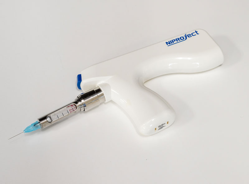 注射器を電動にすることで、麻酔液を注入するスピードをゆっくりと一定に制御し、また、細い注射針を使用することで、痛みの少ない麻酔注射が可能となります。