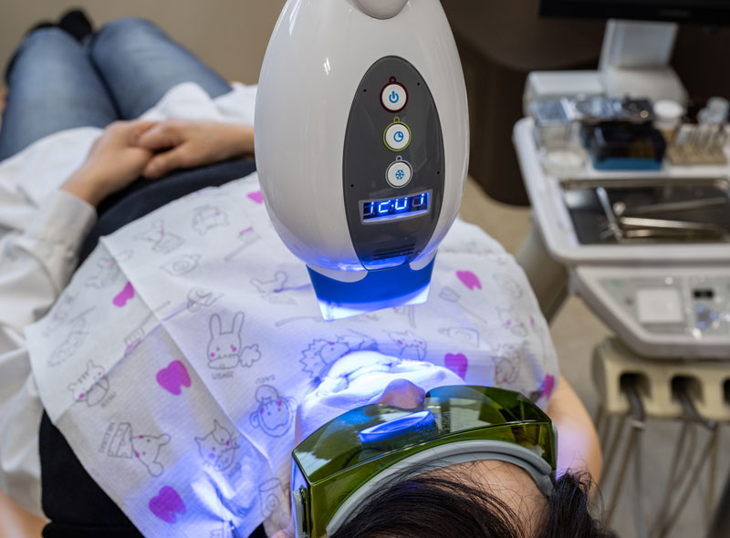 光照射歯の表面にホワトニングジェルを塗布し、特殊な光を複数回照射します。ジェルに含まれる過酸化水素の反応により着色成分が分解され、本来の白さに近づいていきます。