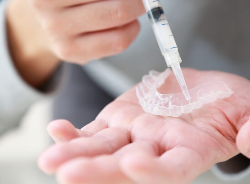 トレーサイズが合わない場合は自分専用カスタムトレーを作製し、専用ホワイトニング剤をトレーに入れて行います。
